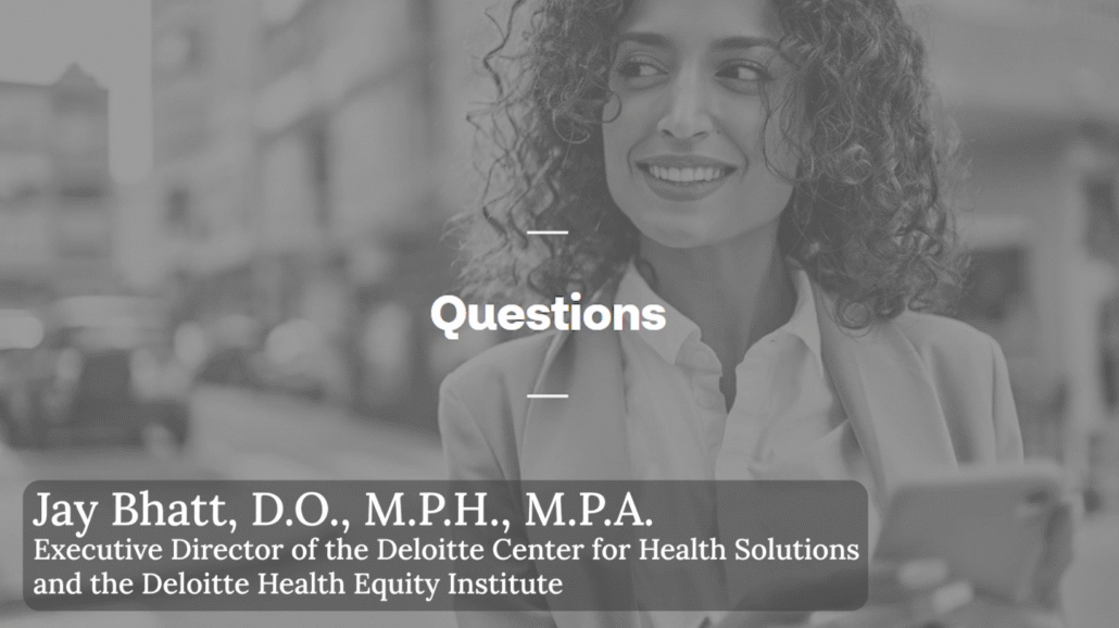The moderator also asks what organizations can do to make health equity a reality. The answer, from a presenter who works at the major consulting firm Deloitte: