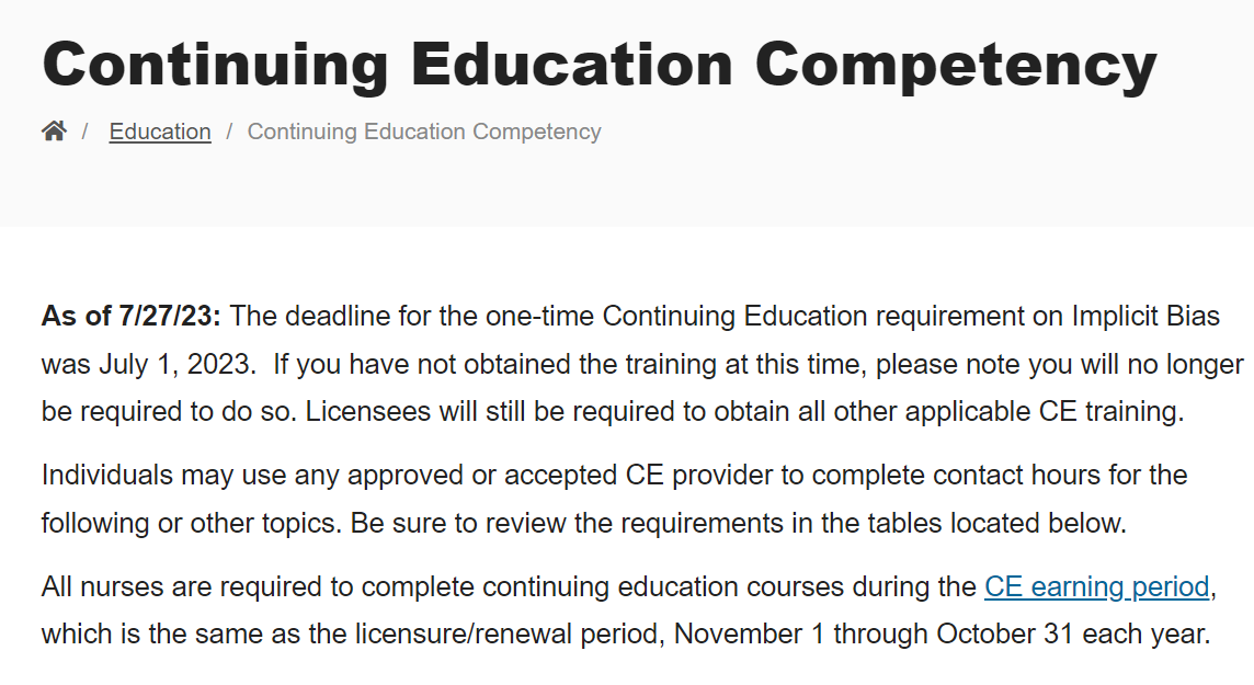 The deadline for completing an approved implicit bias course was July 1, 2023. However, according to the KBN website as of July 27, the mandate has been removed. “If you have not obtained the training at this time,” the Continuing Education Competency webpage states, “please note you will no longer be required to do so.”