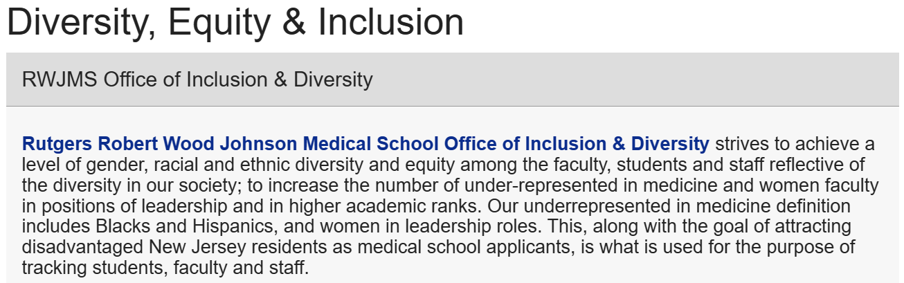 The Rutgers New Jersey Medical School (NJMS) in Newark and the Robert Wood Johnson Medical School (RWJMS) in Piscataway both have active DEI offices with many of the typical “resources” to promote its social justice positions. RWJMS even says that its “racial and ethnic diversity and equity” efforts for faculty and student numbers specifically target “Blacks and Hispanics.”