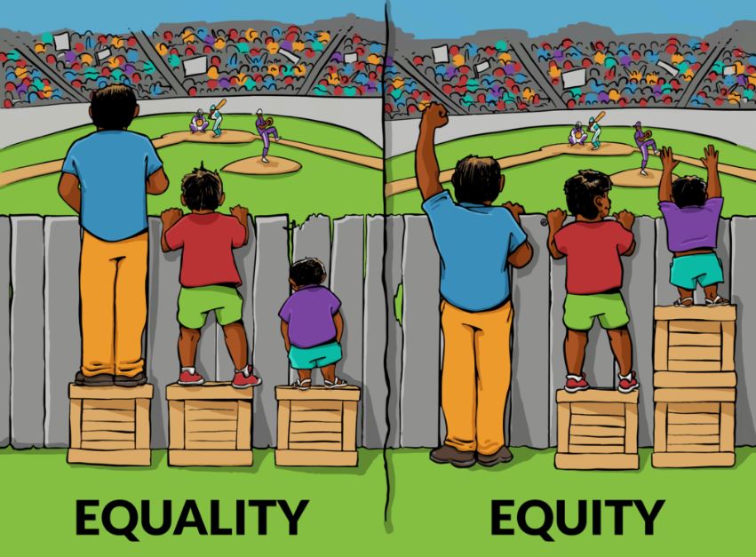 The module begins by comparing DEI to a “party”: diversity is being invited to a party, inclusion is being asked to dance, and equity is “leveling the playing field” and “dancing without barriers.” Accompanying this is the misleading illustration of children on boxes watching a baseball game.