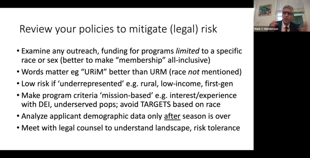 And finally, Henderson concluded by encouraging residency program directors to balance the legal risk of discriminatory practices and policies with the goals of diversity.