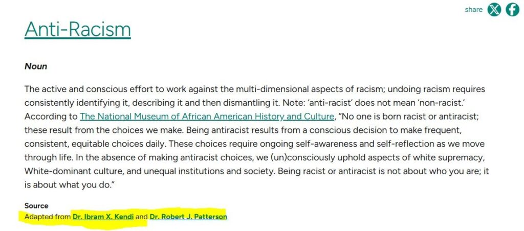 For instance, the definition of “anti-racism” is sourced explicitly from Ibram X. Kendi, a radical proponent of racial discrimination on the basis of remediating past injustices.